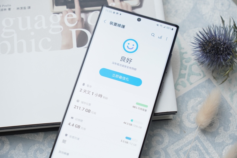 續航力表現和前一代機型相比也有進步,搭載了 5,000mAh 大電池,整天重度使用後電力依然充足。另外從設定中的「電池與裝置維護」現在也可以查看可用電量以及預估可用時間,其他與裝置相關的維護資訊也會統一顯示在此,方便使用者掌握自己手機硬體的健康度。