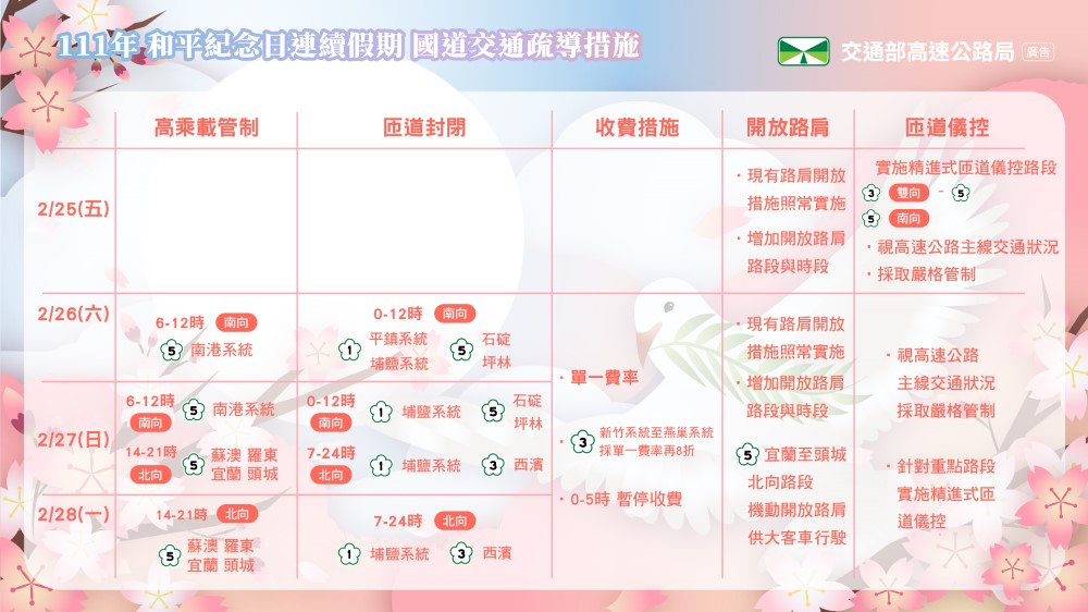 2022 年 228 連假高速公路疏導覽人包:高乘載管制、收費措施、匝道封閉