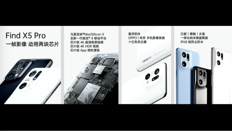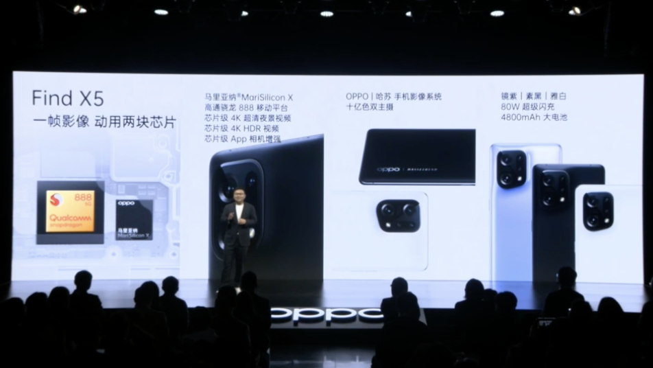 在 OPPO Find X5 機種上,雙鏡頭採用感光元件 IMX766,並同樣搭載 MariSilicon X 處理器,為靜態和動態拍攝帶來精彩細緻的影像紀錄。配備 6.5 吋 120Hz 億級色彩螢幕、支援 80W SUPERVOOC 超級閃充、30W AIRVOOC 無線閃充等強勢規格。