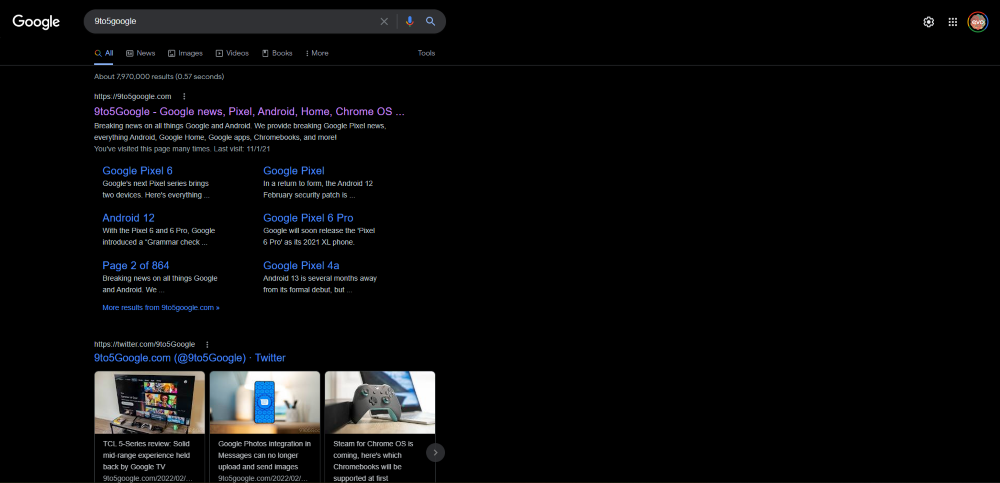 2 月 11 日,Google 宣布將於桌面、行動版本上推出全新的深色模式,黑色(#000000)的深色主題目前仍在進行 A/B 測試。被選中的使用者可以在快速設定(右上角齒輪圖示)中開啟。如下圖所示,新的深色主題除了背景改為黑色之外,連結字體顏色的飽和度更高;相形之下,深灰色的深色主題視覺上更為柔和。