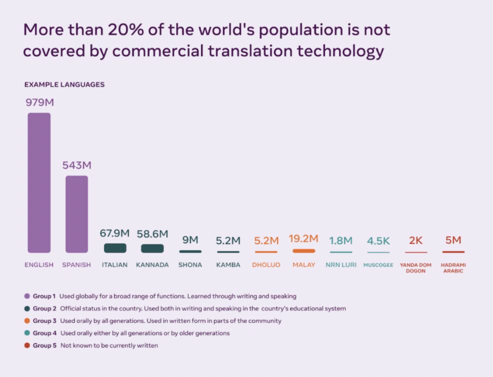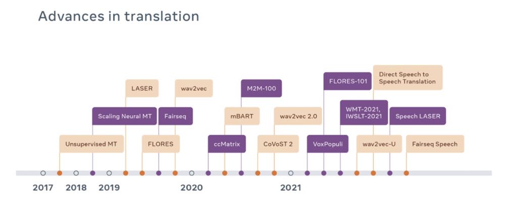 Meta AI 即將宣佈一項打造語言及 MT 工具的長期計畫,其涵蓋絕大多數的語言,並分為兩個新專案。第一個專案名為「所有語言皆重要」(No Language Left Behind),Meta 正在建立全新的進階人工智慧模型,可以從實例較少的語言中學習訓練,Meta 將用它來達成數百種語言的專業級翻譯,其提供的語言類別從阿斯圖里亞斯語、盧干達語到烏爾都語應有盡有。