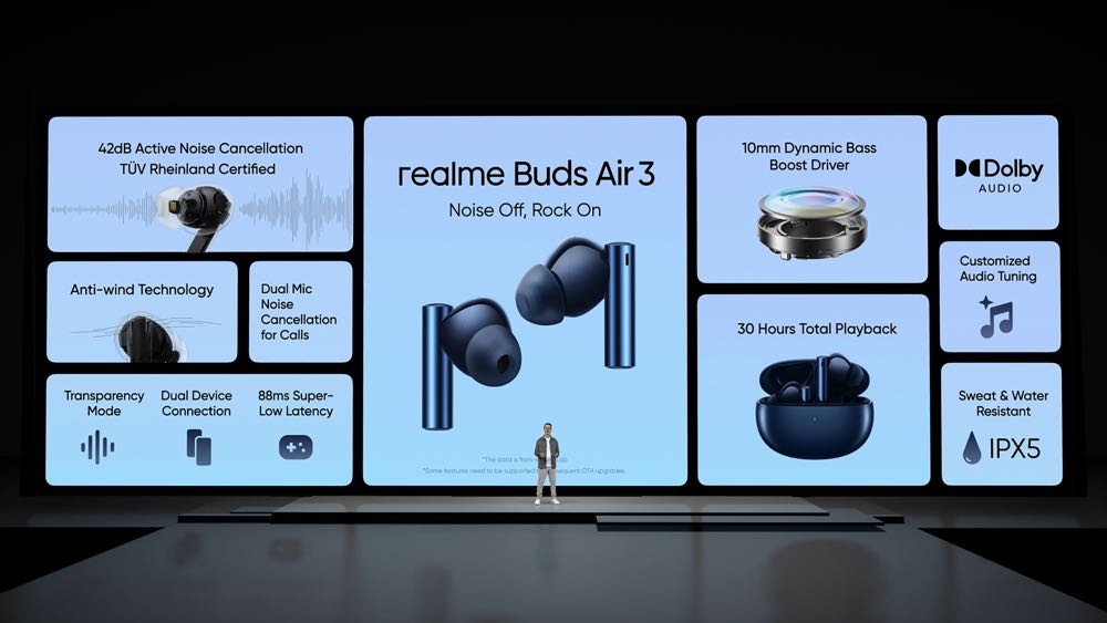同場加映的還有搭載 42dB 主動降噪的 realme Buds Air 3,其為業界首款通過 TÜV 萊茵高性能降噪認證的真無線藍牙耳機,支援產業領先的抗風噪技術,透過內建的空氣動力學結構和抗風噪演算法,無論環境如何吵雜都能帶給用戶舒適的聆聽體驗;音質方面,採用新型液晶聚合物複合材料製成的 10mm 大驅動單元,擁有飽滿深沉聆聽享受的同時,還具備 546mAh 大容量電池,含充電盒播放總時長可達 30 小時。