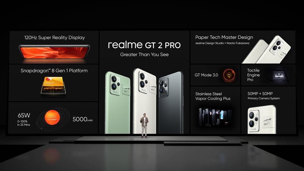 除了發表 UDCA 外,realme 也於 MWC 2022 上推出 realme GT 2 系列,宣告正式前進高階智慧型手機市場,其中 realme GT 2 Pro 更是 realme 首款高階旗艦機,其搭載高通最新 Snapdragon 8 Gen 1 旗艦處理器,集多項突破技術於一身,包含手機背蓋「大師·紙」設計、150° 超廣角鏡頭和先進的全速天線矩陣系統等等,將成為 realme 創立至今的巔峰之作,並預計於 3 月引進台灣市場與大家見面。