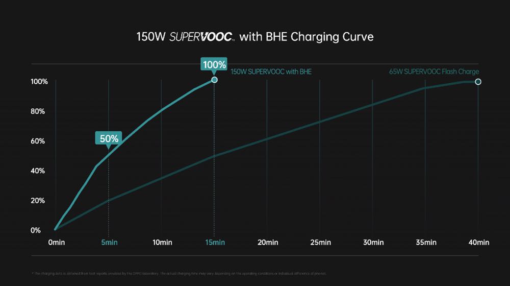 長壽版 150W 超級閃充沿用 OPPO 電荷泵直充技術,5 分鐘即可將等效 4500mAh 電池容量的手機從 1% 最高充至 50%,最快 15 分鐘充至 100%。此外長壽版 150W 超級閃充的適配器比同等功率的常規產品更小巧,僅為 58 mm x 57mm x30mm,重量為 172g ,在兼顧高效與便攜的同時,功率密度顯著提升。