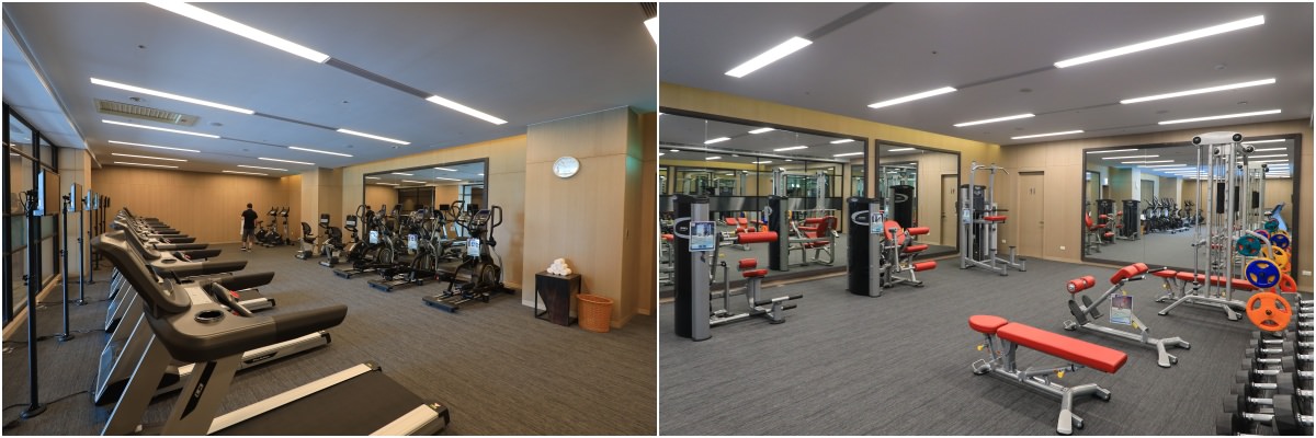健身房的設施很豐富,有數量很多的跑步機、踏步機,還有全套的重訓裝置。