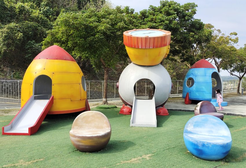 ▼賽堤廣場,最後的壓軸就是小朋友最愛的遊樂設施,這裡不僅有太空梭裝置藝術,還有火箭造型溜滑梯、星球座椅等等,小倆口光是這一區就玩得不亦樂乎~~