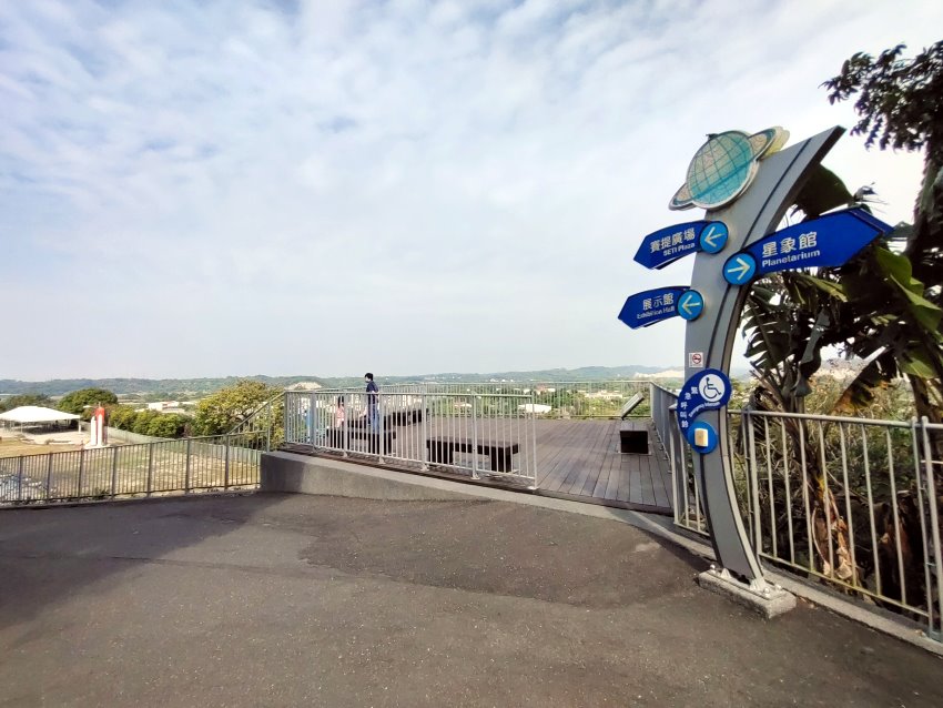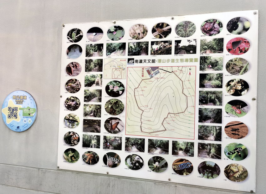 ▼接著我們要前往最後一個展館「天文觀測館」,會先經過觀景平台,可以俯瞰遠方大內月世界的泥岩惡地景色,還有園區常見鳥類的標示,有興趣的朋友掃描QR Code還能聽見不同鳥類的叫聲唷!