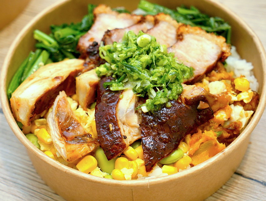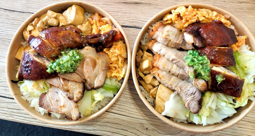 桃園美食「肥美快餐」燒臘便當就位於桃園區大業路一段上、常排隊的萬大蜜汁炸雞旁、大業寶山黃昏市場對面,去年剛開業的時候我們就很納悶,為何這間「吾當飲」飲料店排成這樣?走近一看才發現原來這是間不折不扣的燒臘便當店,每到營業時間總是大排長龍,沒排隊吃不到,而且很容易提早賣完打烊,想吃的朋友真的要趁早!他們家有提供花椒櫻桃鴨、招牌油雞腿、脆皮燒肉、蜜醬叉燒等四種燒臘主菜,大家可以單點一種或是雙拼、三寶、大四喜都沒問題,也可以單切肉盤或是直接買全雞(需預訂)、全鴨、半鴨、1/4鴨都可以,我們也是第一次看到燒臘便當用櫻桃鴨、桂丁土雞當燒臘食材,真的是太狂啦~~而且配菜口味適中,不會過於鹹重,每天都有變化,算是我們最近吃到最愛的燒臘便當店了!