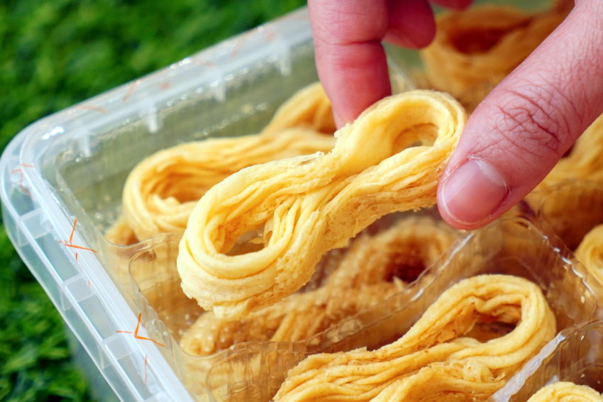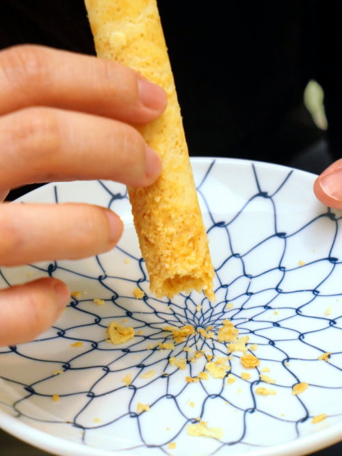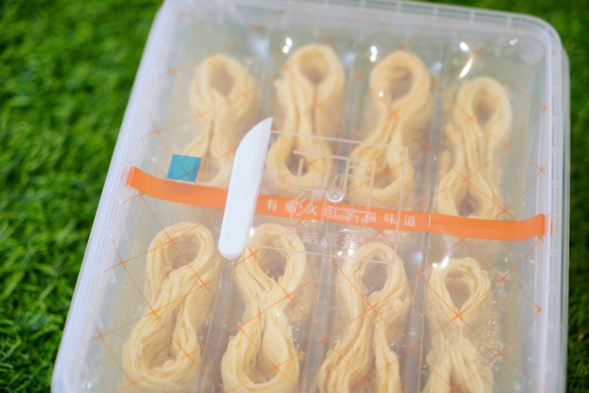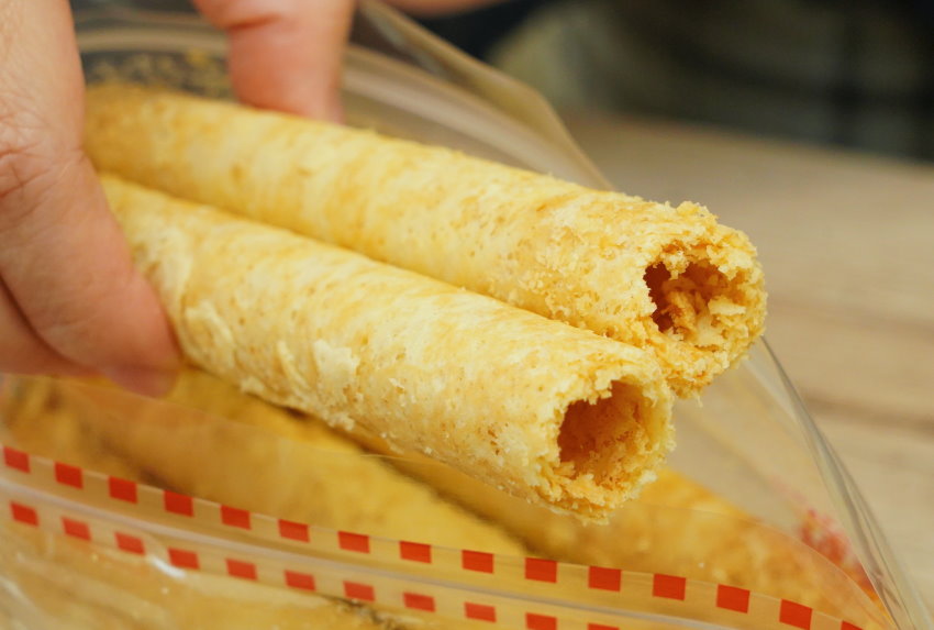 ▼蛋捲採用8字造型,一口一個剛剛好,帶點香酥鹹甜的味蕾,一開始吃起來很新奇,吃到後來會覺得有點偏鹹,比較沒這麼耐吃!