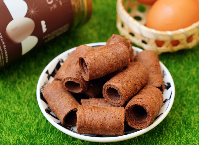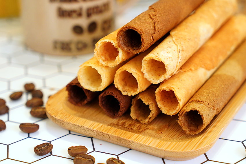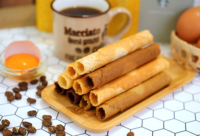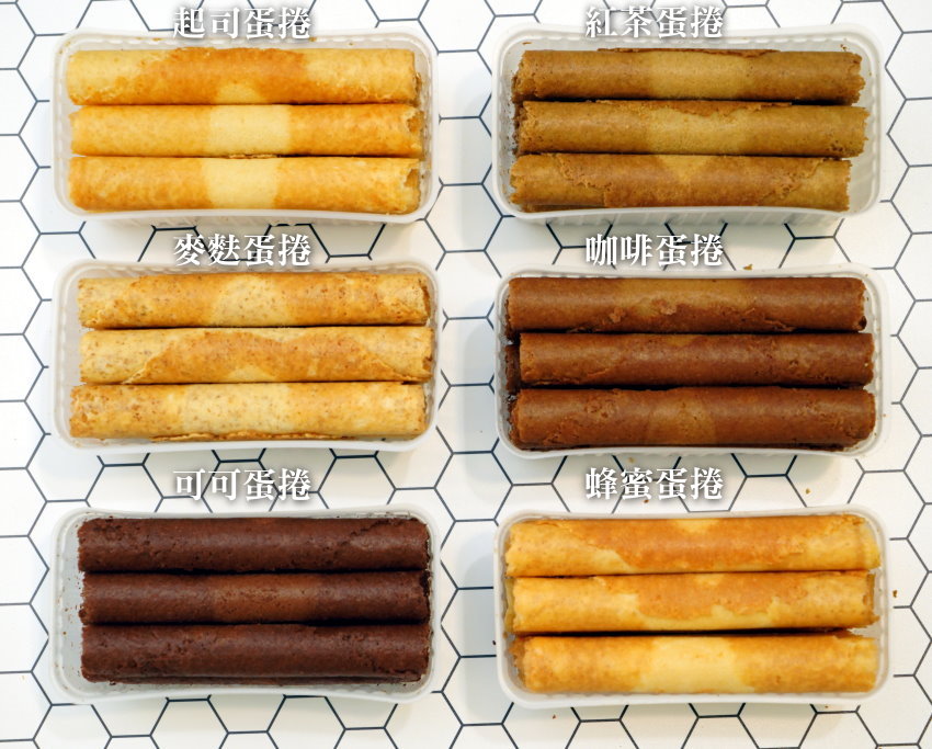 3.蛋捲以優質雞蛋製成,嚴選咖啡、可可、紅茶、蜂蜜、起司、麥麩等六種不同口味,滿足喜愛多元與嘗鮮的朋友!