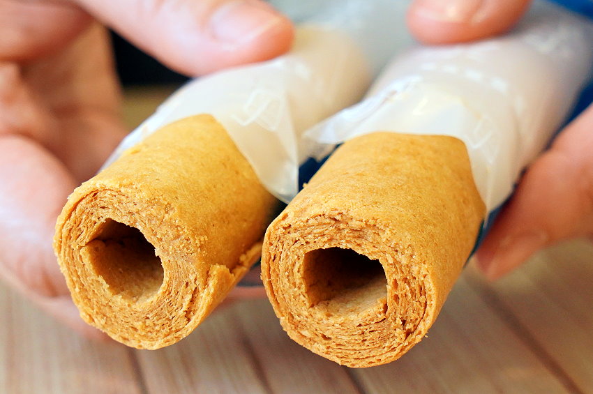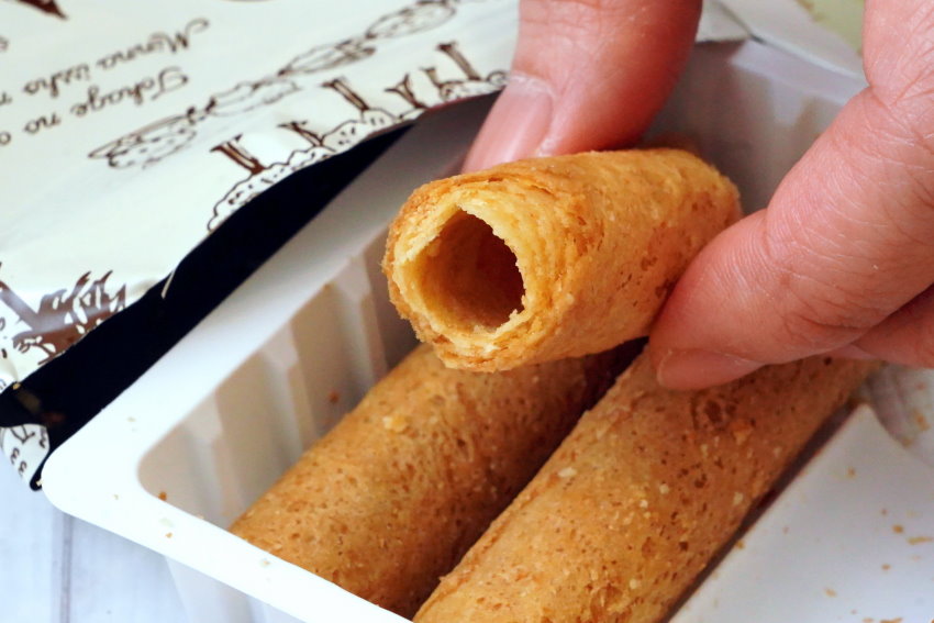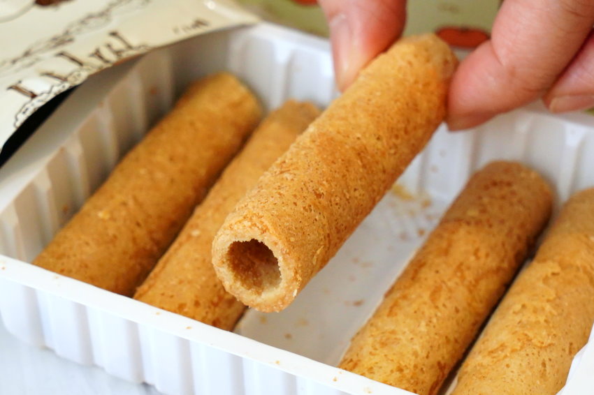 ▼打開一看,裡頭是5支裝蛋捲,蛋捲間還有稍微隔開以免因碰撞而碎裂!