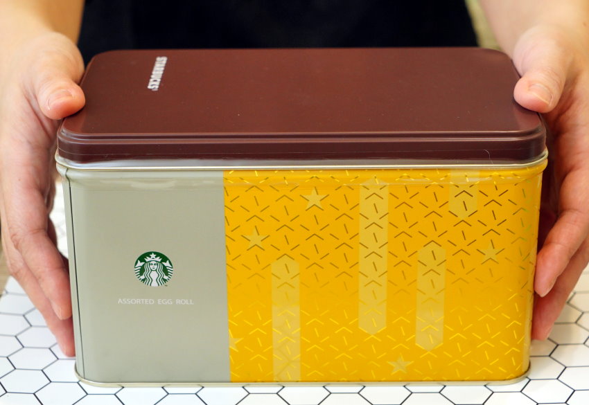 ▼「星巴克臻選綜合蛋捲禮盒」外盒頗有質感,上頭簡單印有LOGO,搭配側邊的亮黃色花紋,走的是簡約又帶點時尚風格~~