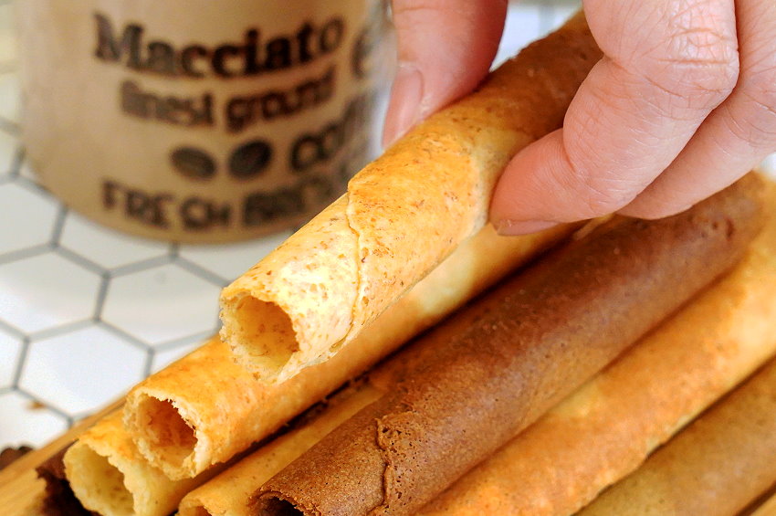▼一共有咖啡、可可、紅茶、蜂蜜、起司、麥麩等六種不同口味蛋捲,光從香氣就能大致分出口味!
