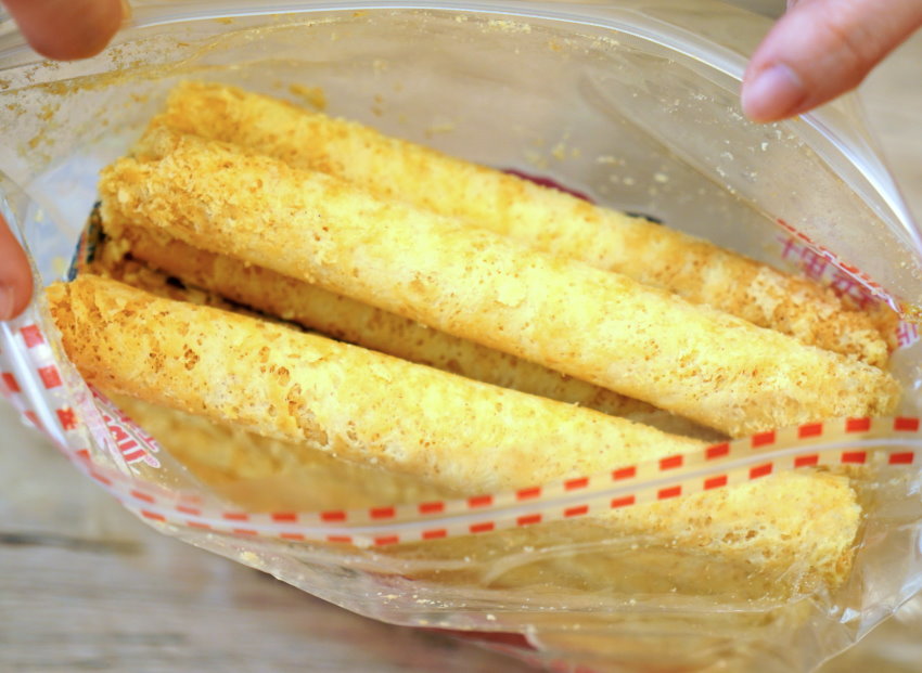 ▼包裝打開就是長長的蛋捲放在裡頭,不管是拿取或食用都很容易掉屑,吃的時候會比較困擾,尤其是小朋友吃的話更是要接好接滿(笑)!