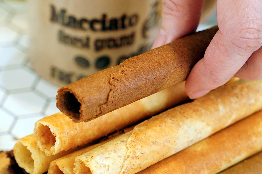 ▼一口咬下,就能吃到濃稠的巧克力香氣與迷人蛋香,微微苦甜的滋味不會搶走蛋香的風采,在嘴裡達到完美平衡,是比較偏大人的成熟風味!一般來說我們不會特別偏好巧克力口味,但他們家的巧克力蛋入蛋捲我們很能接受,而且一口一根剛剛好,輕鬆優雅就能享用到蛋捲的美味!