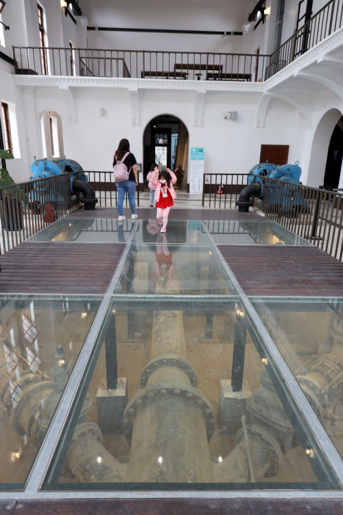 ▼裡頭有四組唧筒機,由濾過器室快濾後的清水,會先匯集到第二唧筒井進行水量調節,再藉由火力發電的唧筒機送到地勢較高的淨水地區!