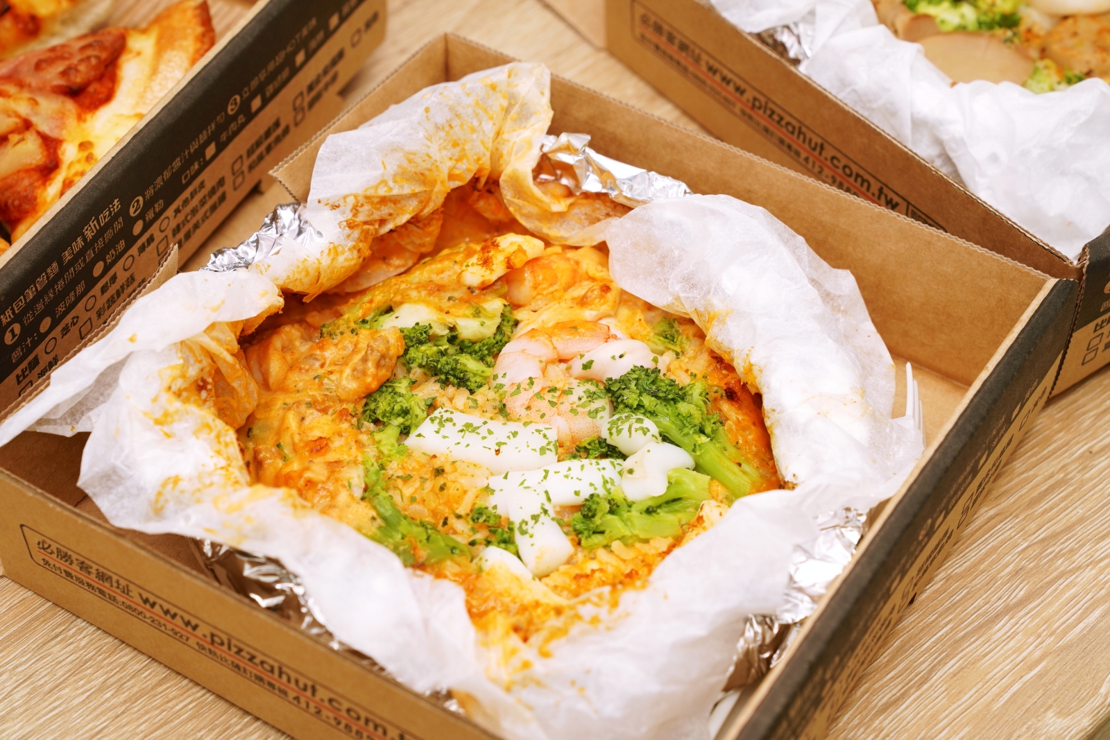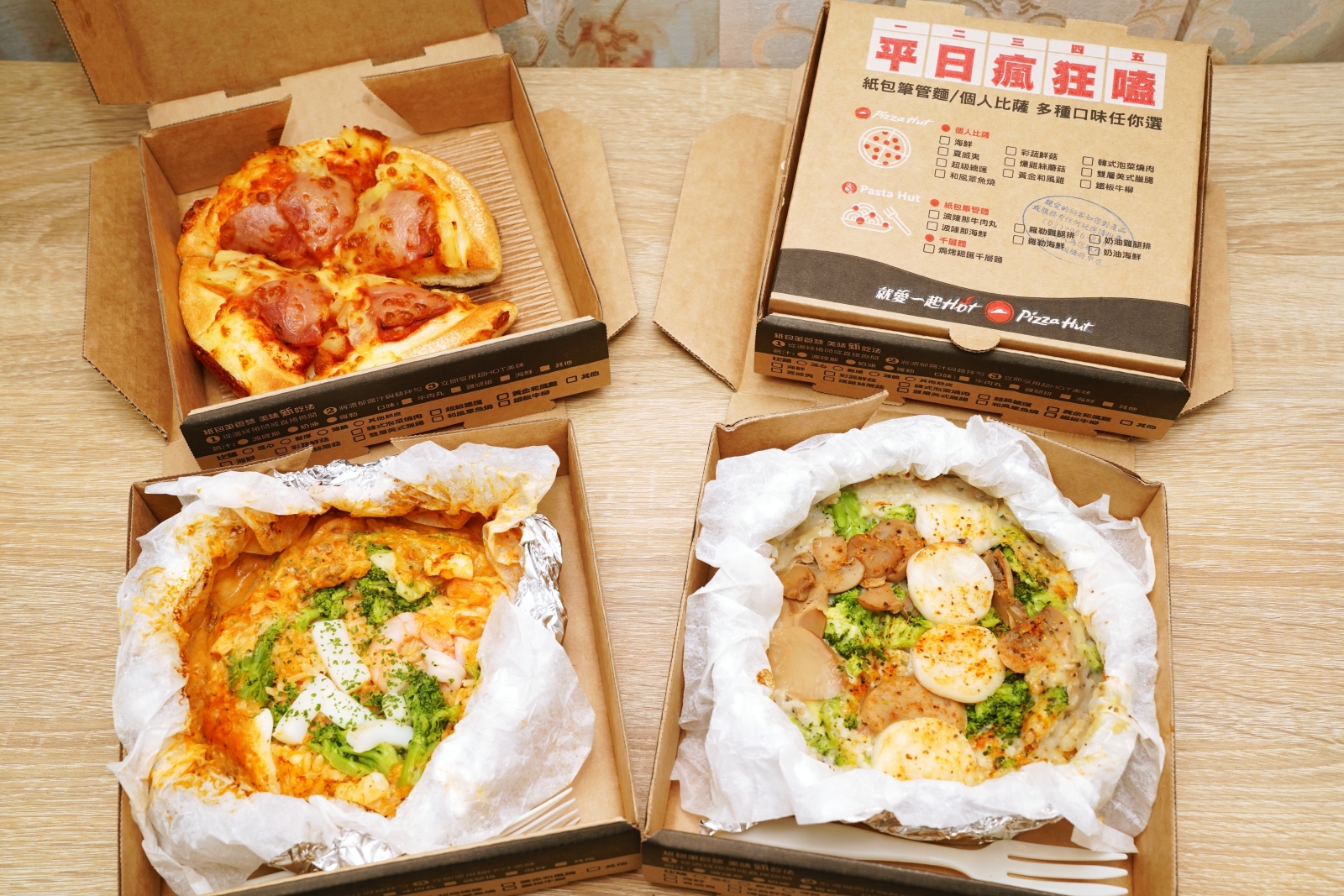 除了常態性的優惠,為了歡慶紙包飯上市,即日起到 4/25 使用 PK 雙饗卡 APP 訂購松露牛肝菌干貝起司或粉紅海鮮起司紙包飯新品,再多送一個夏威夷個人比薩,週一~週五平日限定。