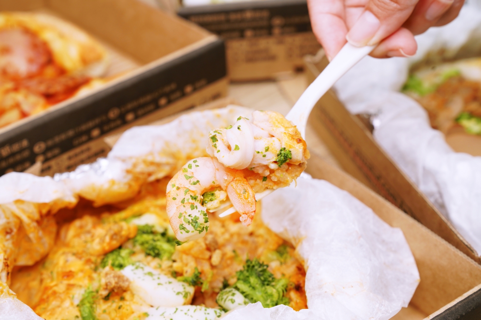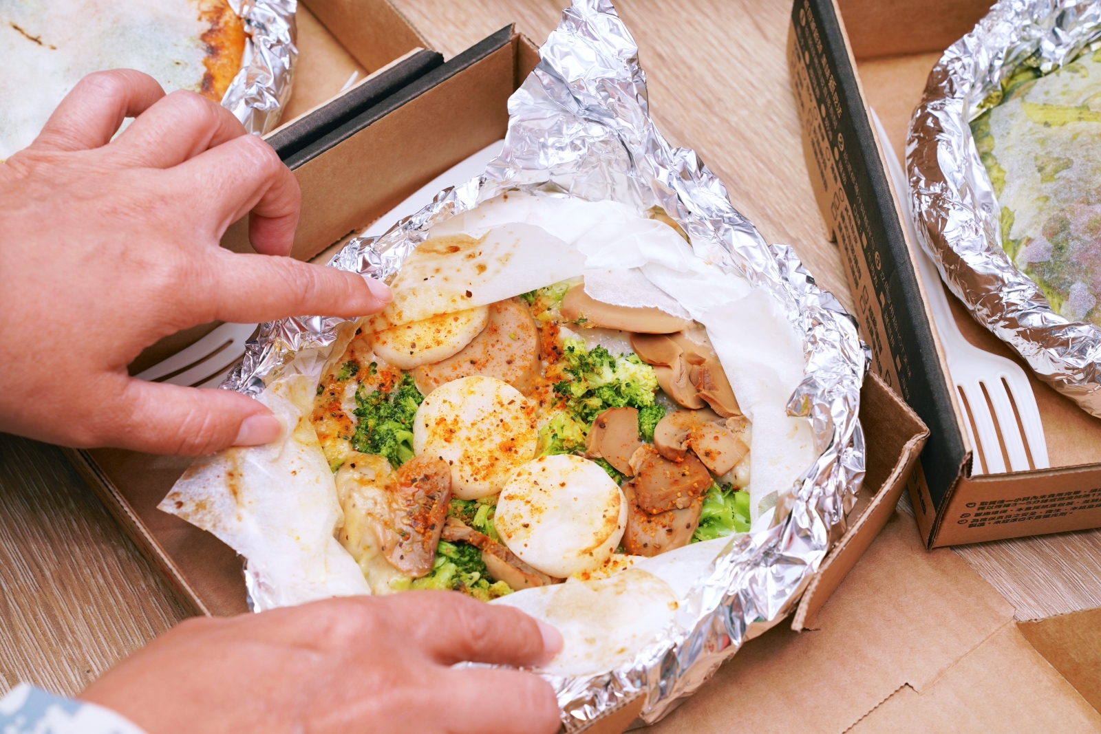 從下訂單到餐點送達僅 30 分鐘的時間,餐點均使用客製化紙盒包裝,拿到手上都還很有熱度。