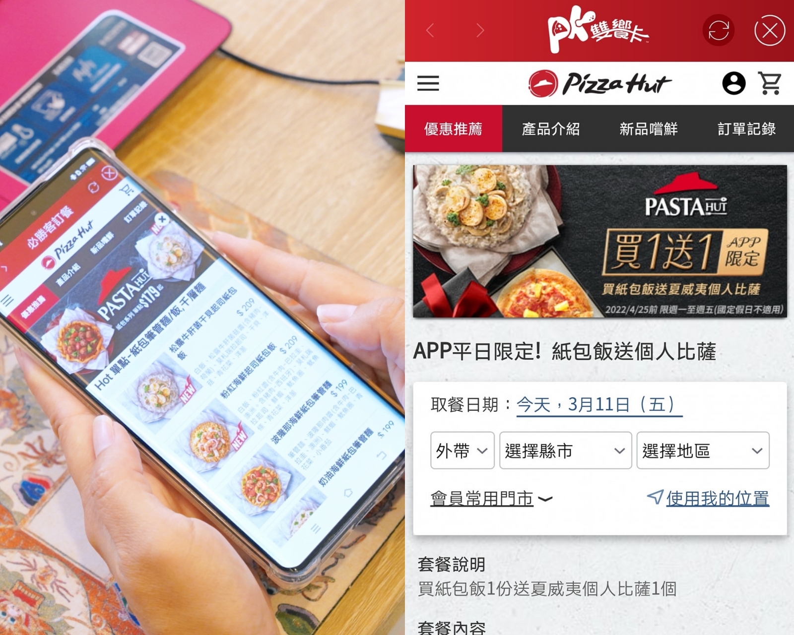 如果你常常點必勝客的外送,建議可下載 PK雙饗卡 APP 加入會員,可用來累積紅利點數抵消費/兌換餐點、享有會員生日禮金、專屬優惠等多項好康。點餐時輸入所在地址,APP 會定位尋找最接近的必勝客製作訂單。