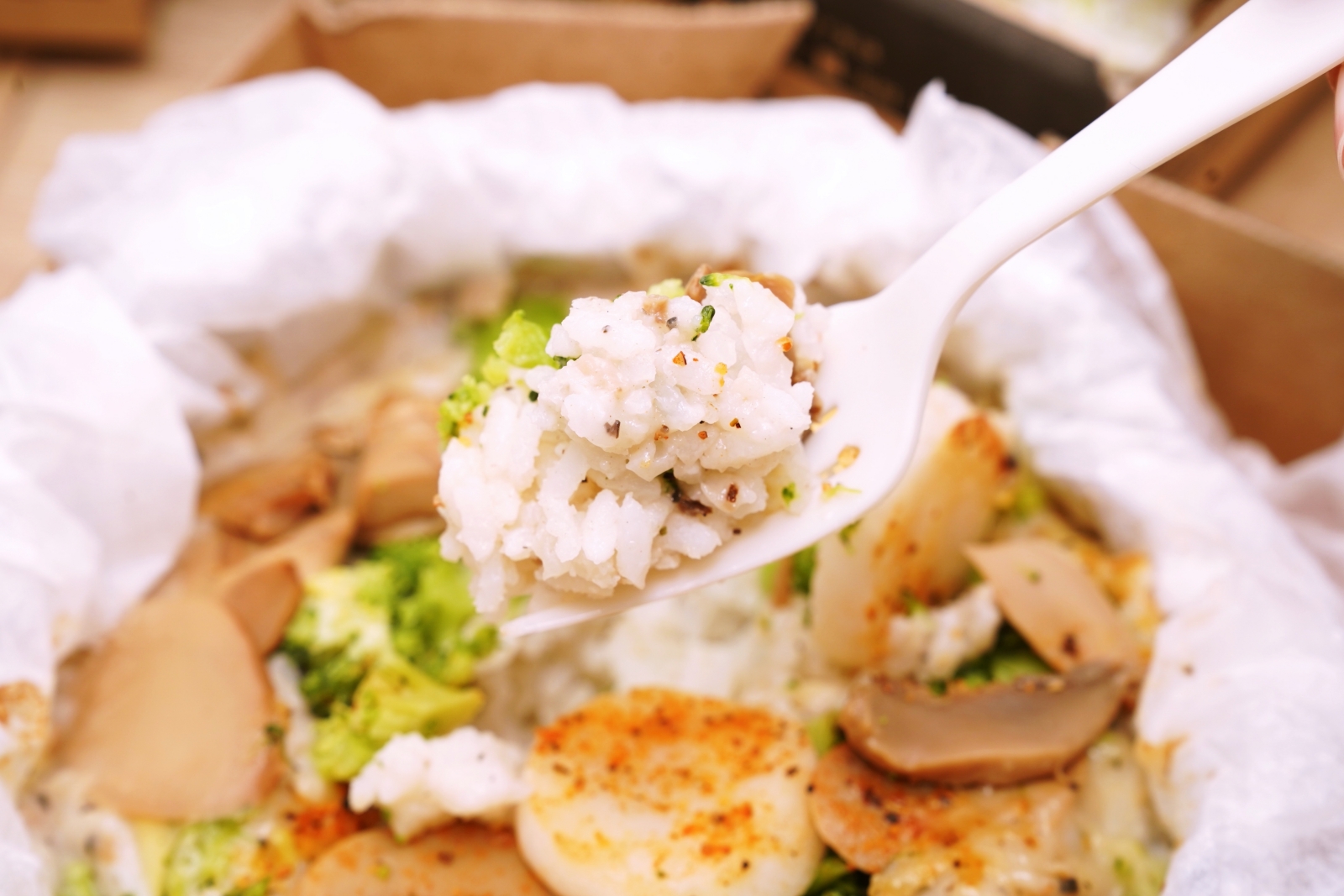 撕開紙包飯看到的完全跟廣告照片一樣,大又圓的干貝一片一片露出,配料不散亂,醬汁不滲出外流。