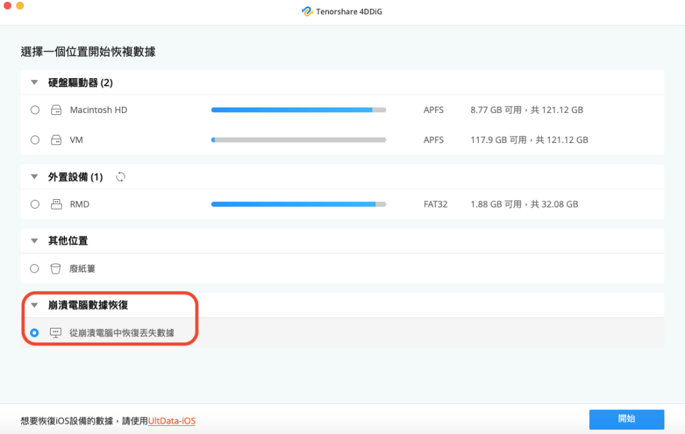 請準備另一台正常運作的電腦並下載「4DDiG」,安裝完成後,點擊頁面下方【從崩潰電腦中恢復丟失數據】選項,接著點擊【開始】。