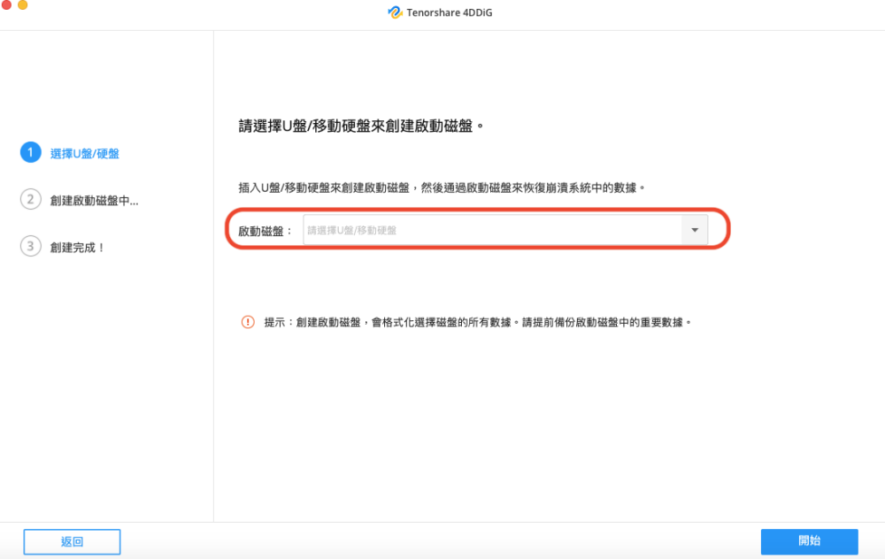 另外準備一個空白的 USB 隨身碟或外接硬碟,並插上正常運作的電腦,接著在軟體頁面上的【啟動磁盤】上選擇它後,「4DDiG」將為你在上面創建啟動磁碟以救援故障電腦上的數據。