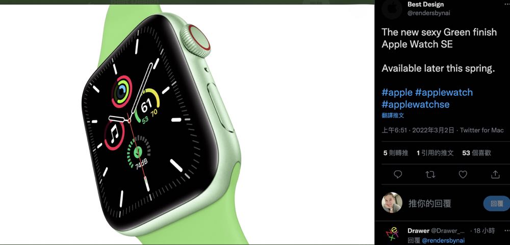 不過除了有確切日期的 iPhone 13 Pro 紫色新色,@rendersbynai 也預告 Apple 會在春季稍晚也為 Apple Watch SE 帶來綠色新色!