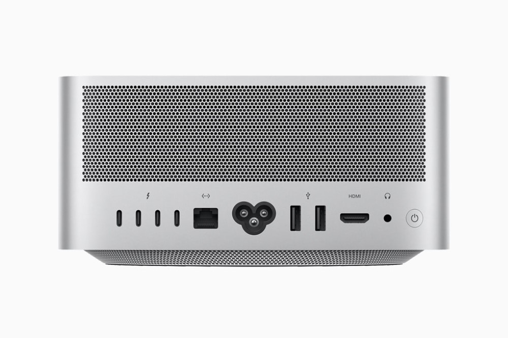 Mac Studio 連接埠相當齊全,背面包含 4 個可連接顯示器的 Thunderbolt 4 埠、10GB 乙太網路埠、兩個 USB-A 埠、HDMI 埠、音源孔,並且支援 Wi-Fi 6、藍牙 5.0。為方便使用者,Mac Studio 正面也配備連接埠,包含兩個 USB-C 埠、支援 Thunderbolt 4,以及 SD 卡讀取槽。蘋果表示,設備最多可連接 4 臺 Pro Display XDR 與一臺 4K 電視。