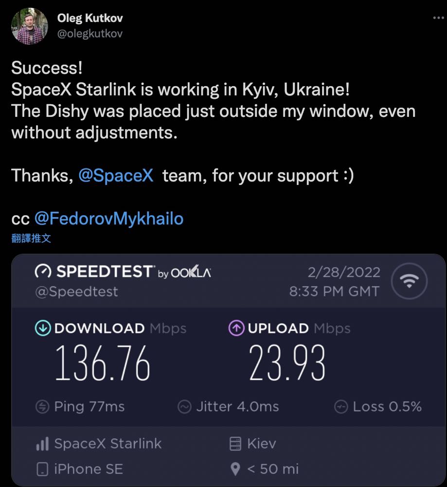 ://twitter.com/olegkutkov/status/1498398598442192904?ref_src=twsrc%5Etfw%7Ctwcamp%5Etweetembed%7Ctwterm%5E1498398598442192904%7Ctwgr%5E%7Ctwcon%5Es1_&ref_url=https%3A%2F%2Fwww.thenewslens.com%2Farticle%2F163591″ target=”_blank” rel=”noopener”> Oleg Kutkov 馬上從倉庫將之前就已經購入,並且設備都已經準備好的 Starlink 天線,啟動服務後也分享了連線後的速度照片!
