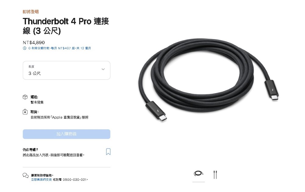 蘋果今年首場發表會落幕後,蘋果官網悄悄上架新的配件「Thunderbolt 4 Pro 連接線 (3 公尺)」。根據產品描述,這條 3 公尺長的連接線採用不易纏繞的黑色編織設計,支援最高傳輸速度可達 40GB/s 的 Thunderbolt 3、Thunderbolt 4、USB 4,具有 100W 的充電能力,售價 NT$ 4,890。一條連接線要近 5 千元,難道蘋果又要再次考驗果粉的信仰?