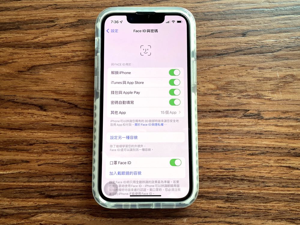 至於大家最期待的戴口罩解鎖功能,更新完畢會於開機時請我們掃描臉部後設定,比較特別的是,即便我們選的是使用口罩 Face ID,但掃描過程中卻是不需要配戴口罩的唷!