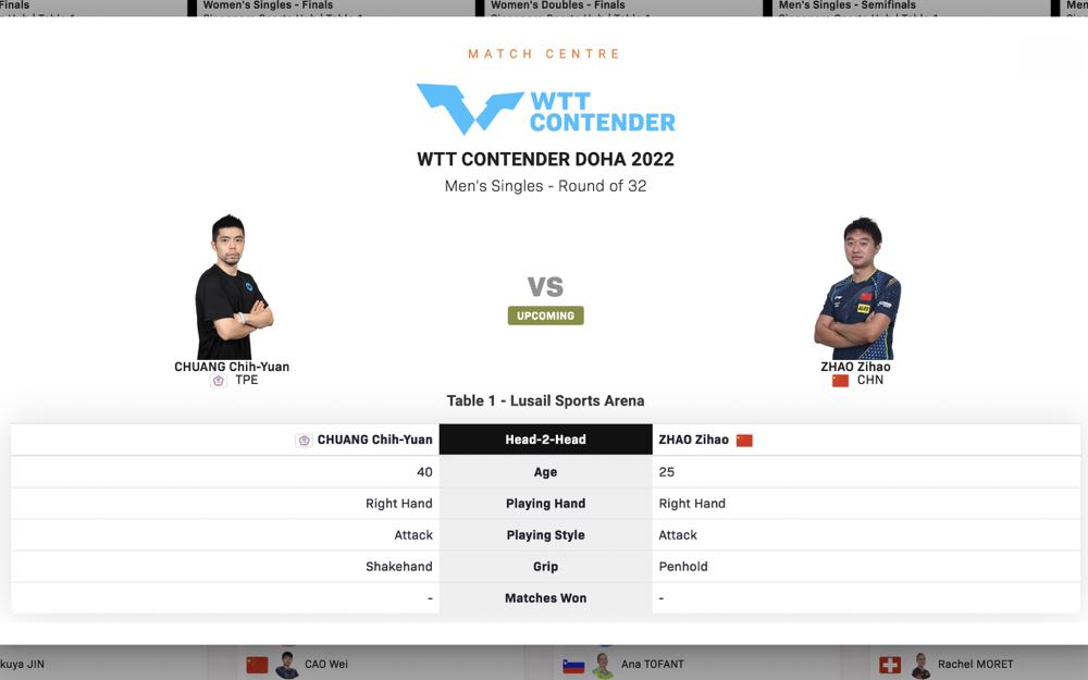 WTT (World Table Tennis) 杜哈挑戰賽將於 21 日正式開打,台灣網球好手林昀儒、莊智淵、鄭怡靜、陳思羽、黃怡樺皆將參與男單、女單、女雙與混雙賽事。杜哈與台灣有著 5 小時的時差,以下賽事時間皆已換算成台灣時間。