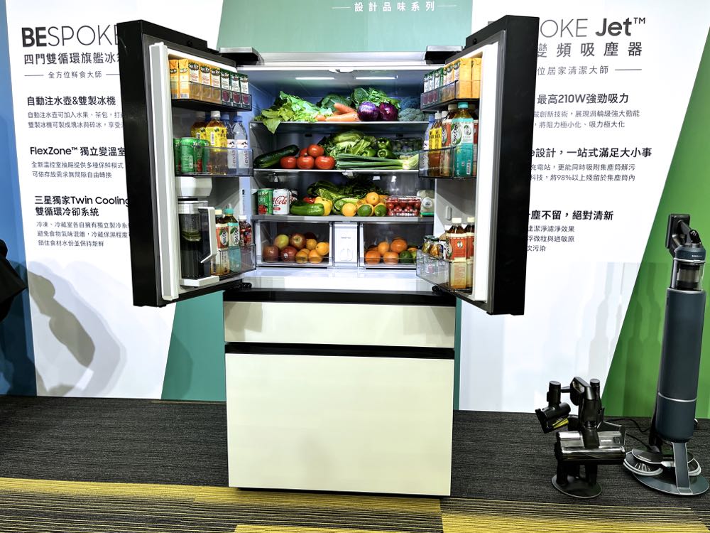 BESPOKE 雙循環四門旗艦冰箱將操控面板放在冰箱內側,外觀上用光澤面板及粉白雙色系來展現出極致的簡約美學。內部配備 FlexZone 獨立變溫室,內建 5 種保鮮模式,讓食材維持在最佳溫度與鮮度,還有三星獨家 Twin Cooling Plus 雙循環冷卻系統,冷凍與冷藏室各自擁有獨立製冷系統與風扇,能鎖住食物養分與水分,保持新鮮。
