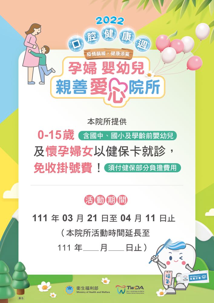 兒童節將至,衛福部鼓勵懷孕婦女、幼兒及青少年接受口腔健康檢查,並善用政府相關口腔保健補助資源,達到「從小保護牙,老來不缺牙」。也提醒大家如果想要前往親善牙醫院所前,建議先電話確認與預約,以節省等候時間!