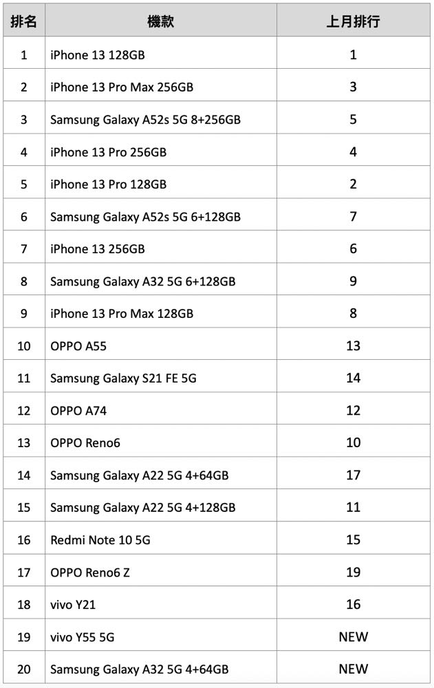 熱銷機種冠軍依舊是 iPhone 13 128GB,但本月進榜的 6 款 iPhone 清一色為 iPhone 13 系列新機,而 6 支中,前 5 名就佔了 4 支。