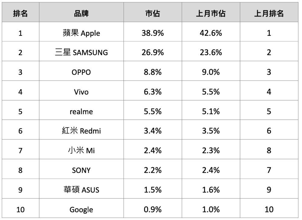 2 月手機銷售量市佔前 10 大品牌依序為蘋果(38.9%)、三星(26.9%)、OPPO(8.8%)、vivo(6.3%)、realme(5.5%),雖說前五名的排行並沒有變化,但仍能看出受到整體環境成績影響,排行第一的 Apple 也從 1 月 42.6% 掉至 38.9% ,但三星與 vivo 受惠於各有一款新機進榜,在數字上則是有些微上升。