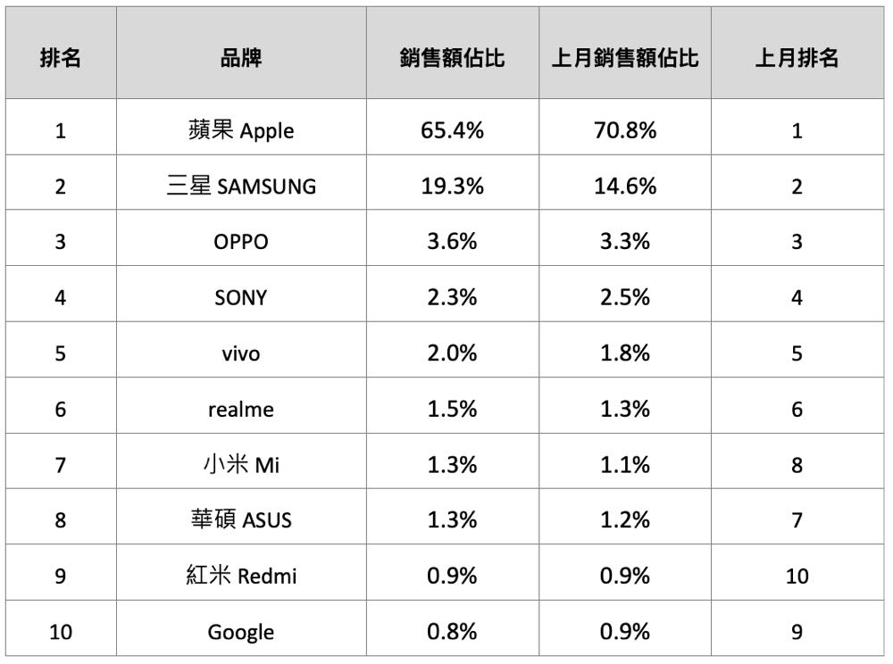 銷售額市佔前 10 大品牌分別是蘋果(65.4%)、三星(19.3%)、OPPO(3.6%)、Sony(2.3%)、vivo(2.0%)、realme(1.5%)。在 1-6 名中名次依然沒有變更,但銷售額方面除了 Apple 從 70.8% 降至 65.4% 趨於疲軟,Samsung 也受惠於 Galaxy S21 FE 的熱銷成績有較為明顯的提升。