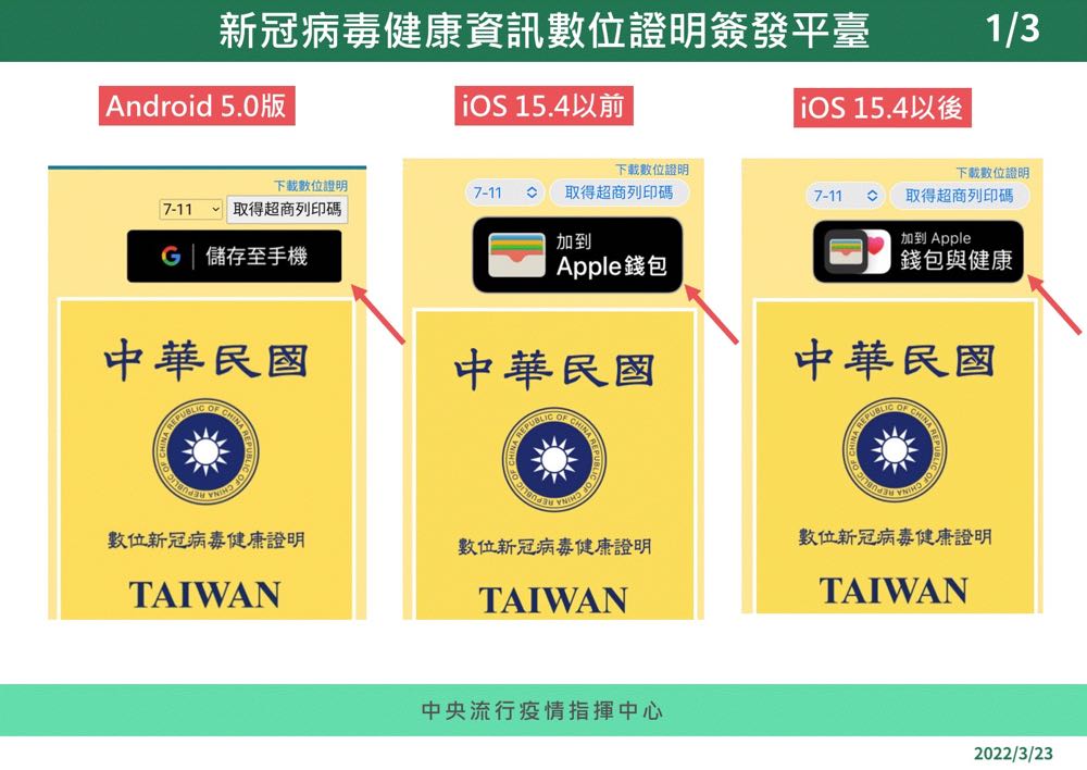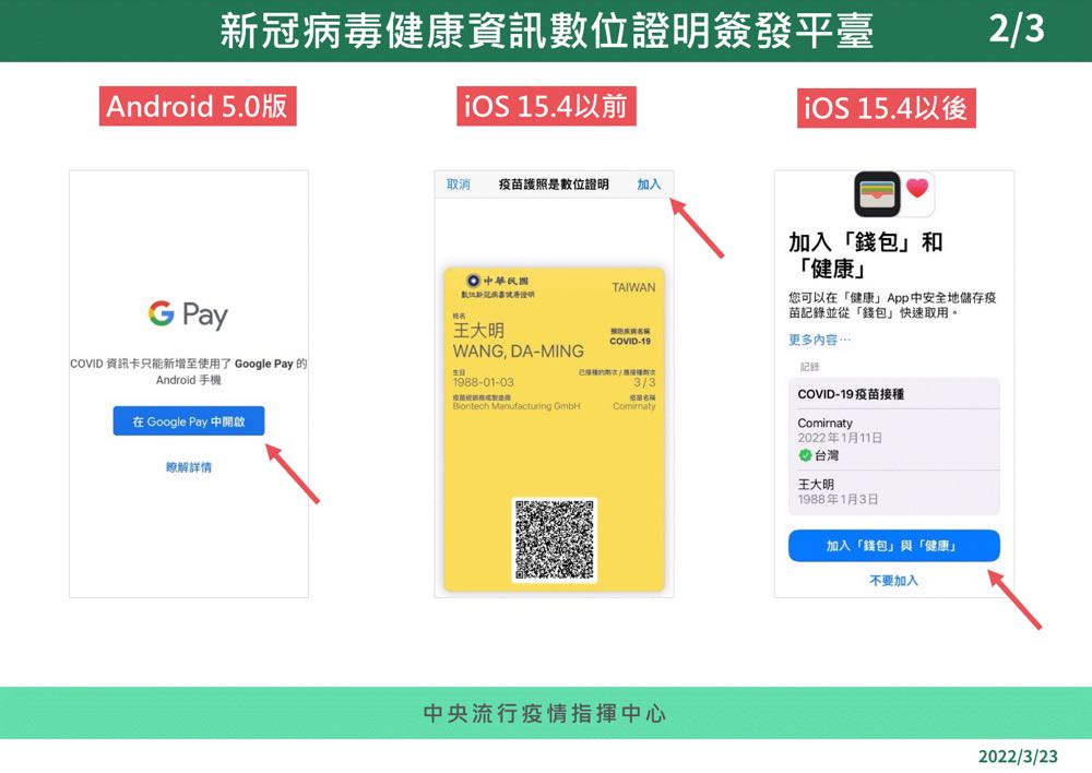 經與 Apple 及 Google 公司合作,現在起將提供民眾使用手機或平板電腦申辦數位證明時,系統頁面增加 Apple Wallet (不限 iOS 15.4版) 及 Google COVID-19 資訊卡 的一鍵加入功能,數位證明可以更快速儲存於手機,方便民眾取用,過程符合個資法及 GDPR 規範。