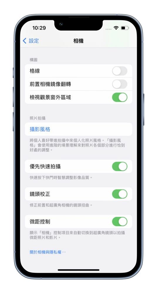 由於「微距」功能並不是預設的,可以先到「設定」>>>「相機」中將「微距控制」打開。