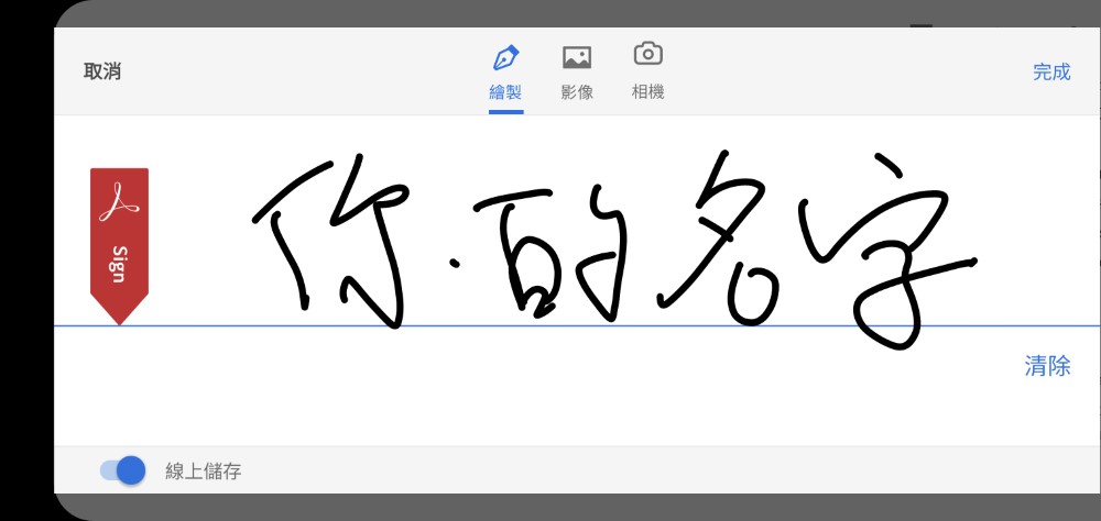• 點選下方工具列最右邊的圖案(墨水筆圖示),選擇「建立簽名」