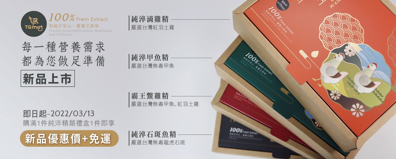 以販售頂級品質的生鮮購物網站TQ mart推出自己品牌囉!【TQ mart純淬精品禮盒】包含:石斑魚精、滴雞精、甲魚精、鱉雞精,不只包裝時尚,不含防腐劑、100%純滴萃取、不摻一滴水、無人工色素、無人工香料,瞬間成為我家日常保養的首選。