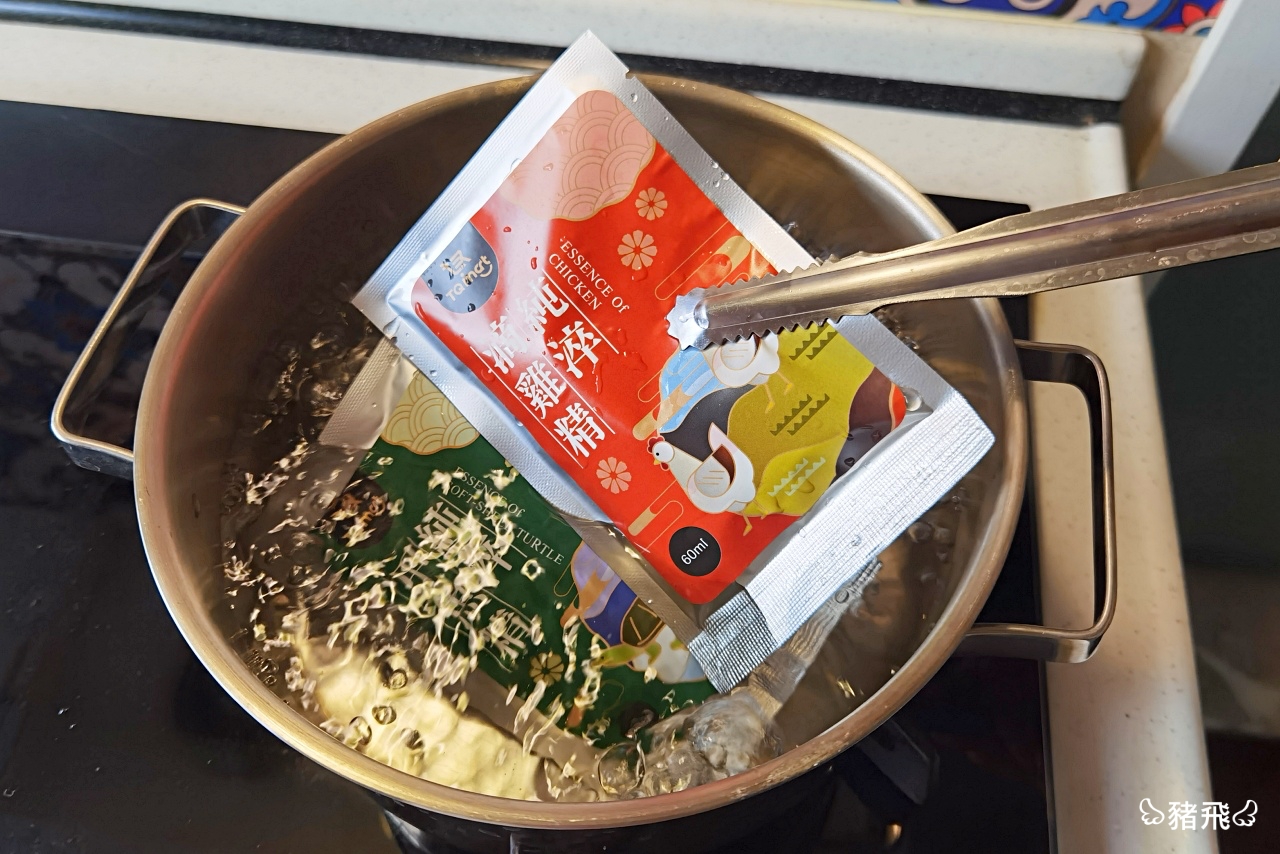 覺得隔水加熱麻煩的話那就不拆包裝,直接整個袋子放進馬克杯裡面,熱水泡到溫熱就可以喝啦!也可以打開鋁箔袋取出冷凍湯塊用電鍋加熱。由於包裝袋是鋁箔材質,不適合用微波加熱喔。