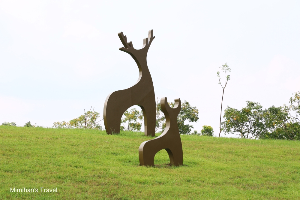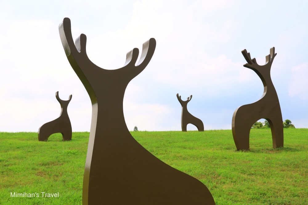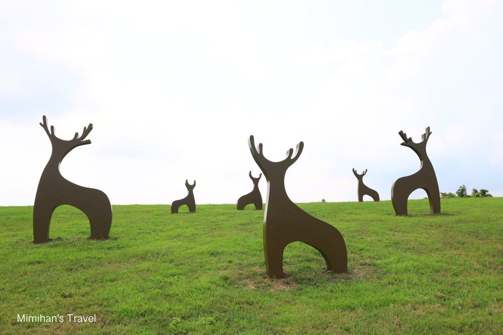 官田遊客中心的戶外也很精彩,有大片草地可以盡情奔跑,天氣許可覺得帶孩子來玩飛盤放風箏很棒,這天還看到有旅人帶毛小孩來玩,喜歡拍照打卡的話,草地上一隻隻造型可愛的鹿絕對是最佳背景。