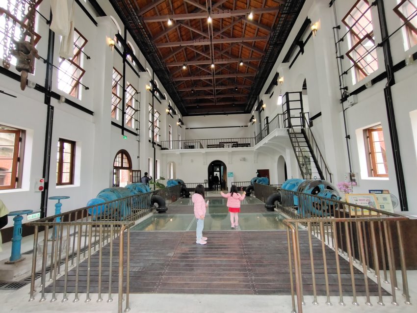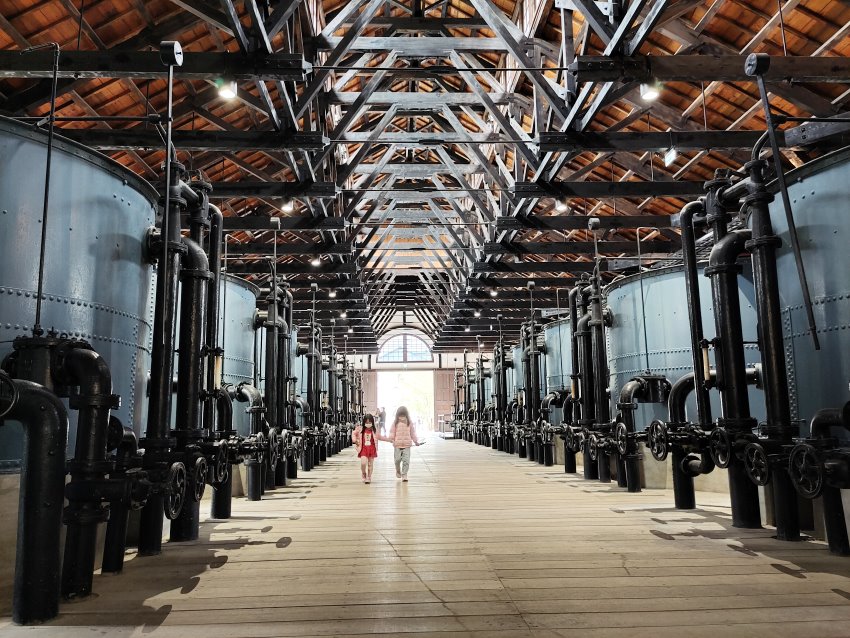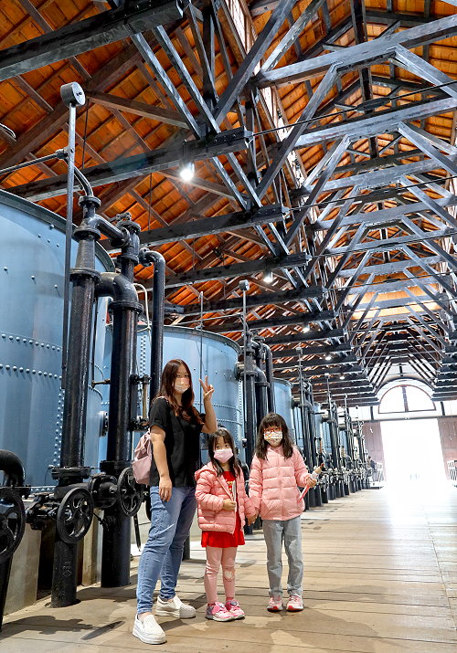▼快濾筒室建於日治時期,主體為磚造建築,為承重力好的廣間型建築,外側設有扶壁柱增加抗震力,此外還有挑高的屋頂,讓室內機具所產生的熱氣可以快速排出,屋架採用太子樓設計,利用浮力通風原理將熱空氣往外排!這一區也是IG網美必拍美照,一旁共有14座英國快濾筒及零件組,至今還保存得很好,也是珍貴的文化遺產!