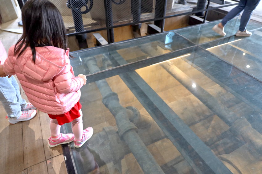 ▼地板部份採用強化玻璃,讓大家可以欣賞到底下的輸送管結構!只見小倆口很膽小,一度還不敢走過去~~哈!