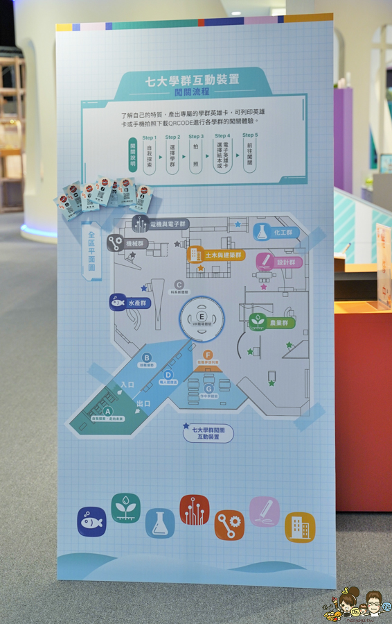 七大學群闖關互動:設計群、化工群、木工與建築群、機械群、電機與電子群、水產群、農業群