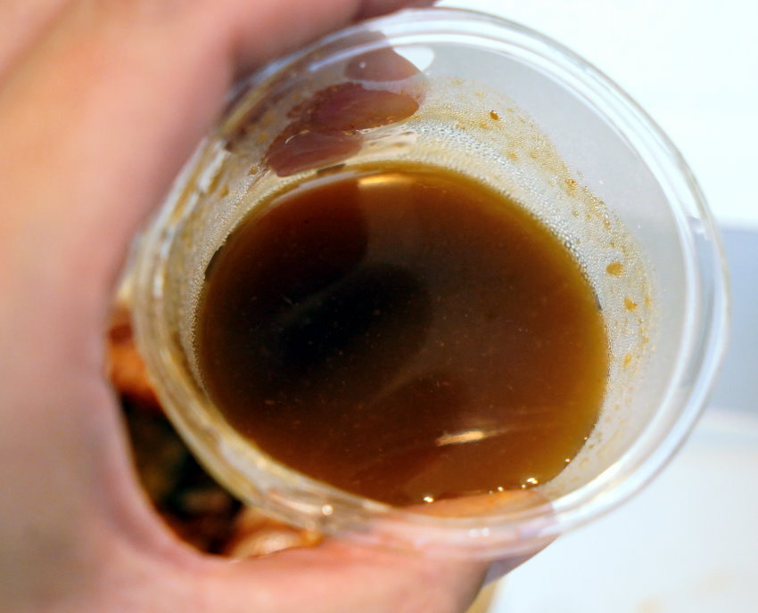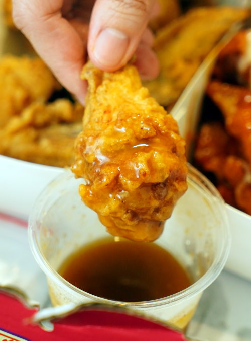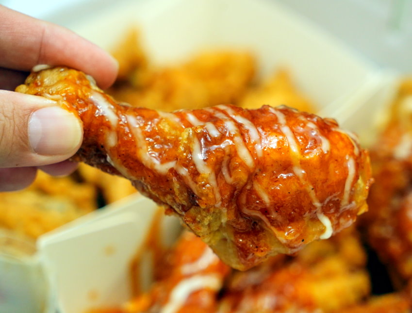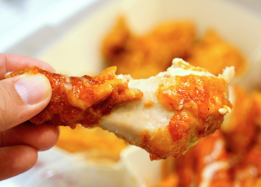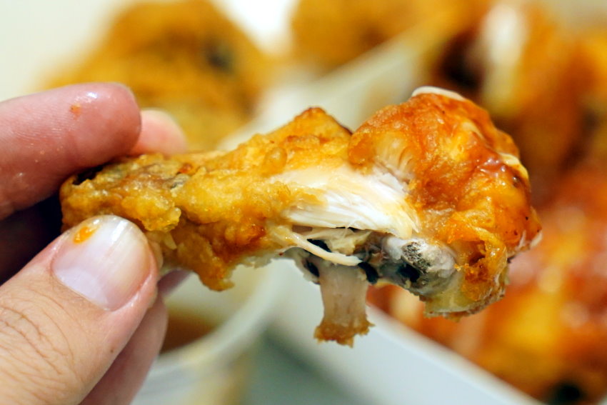 ▼雞腿吃起來外皮薄酥濕潤,裹上醬料後吃起來口感比較偏軟,不像bbq炸雞冷掉還吃得到酥脆口感~~是比較可惜的一點!