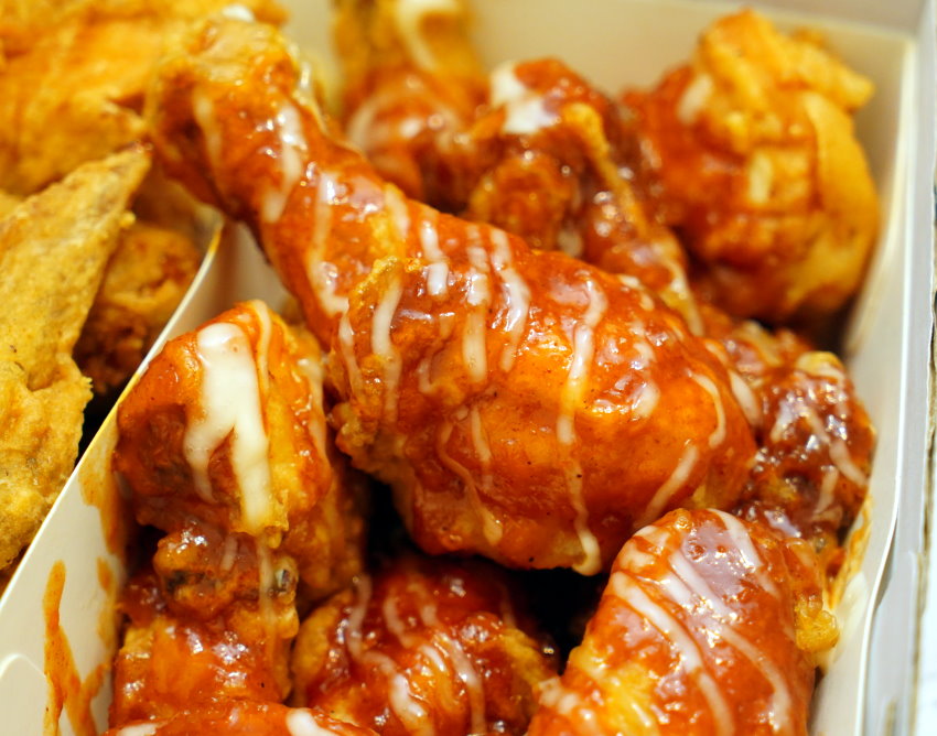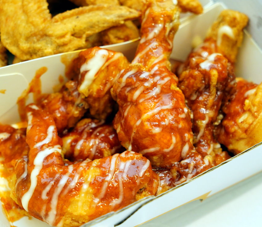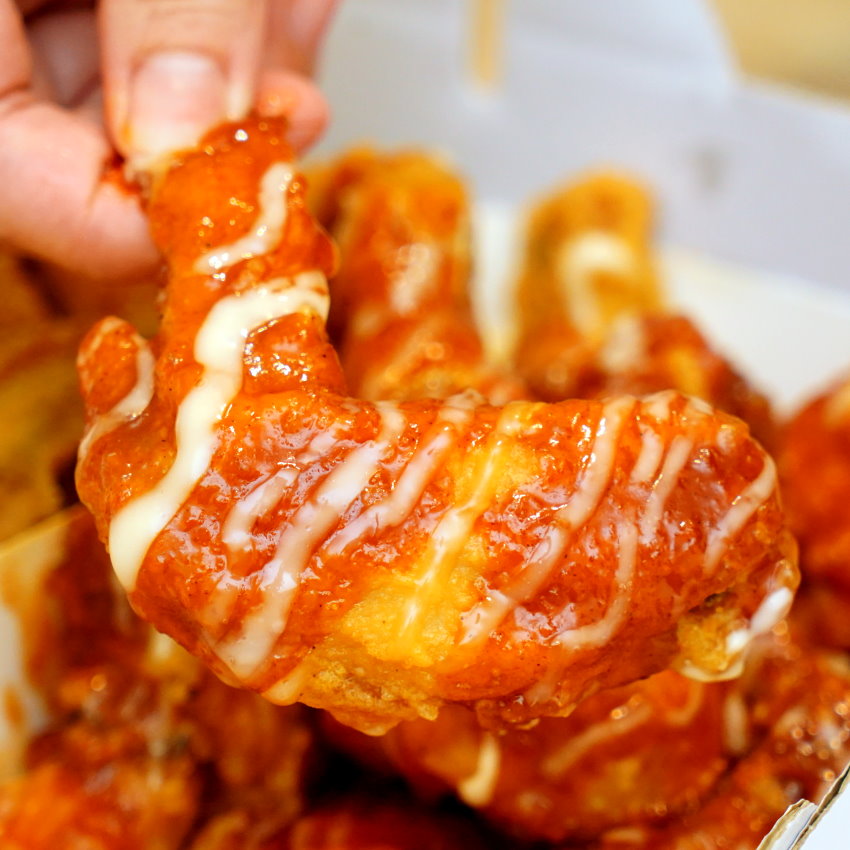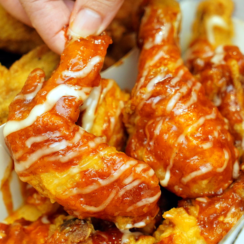 ▼頂級洋釀炸雞,是店內人氣第一的口味,我們當然也要點來吃吃看!這款採用招牌洋釀醬搭配韓是韓式特調白醬,光看就讓人食指大動~~
