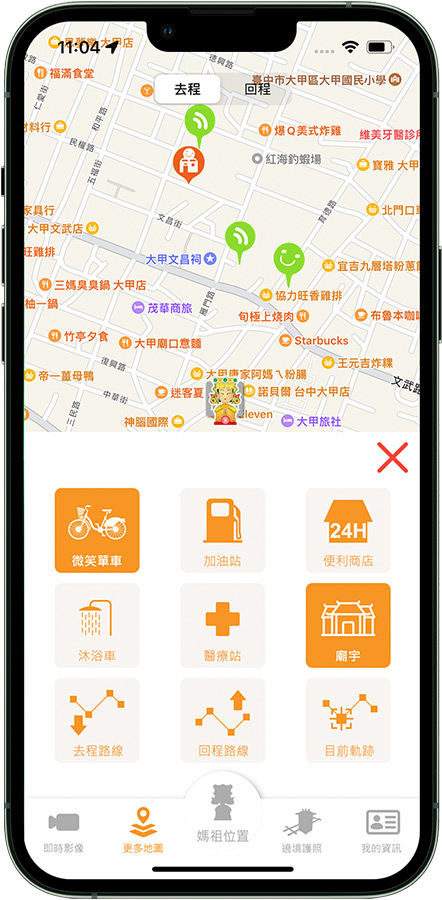 「大甲媽祖APP」不只在手機上可查到媽祖鑾轎的即時位置、超商、速食店、加油站、盥洗站、救護站、微笑單車站點等資訊,也可透過鑾轎上的四支攝影機,從鑾轎視角看到遶境實況。而今年持續與精誠資訊合作,推出優惠商家資訊平台,提供遶境活動優惠商家資訊。