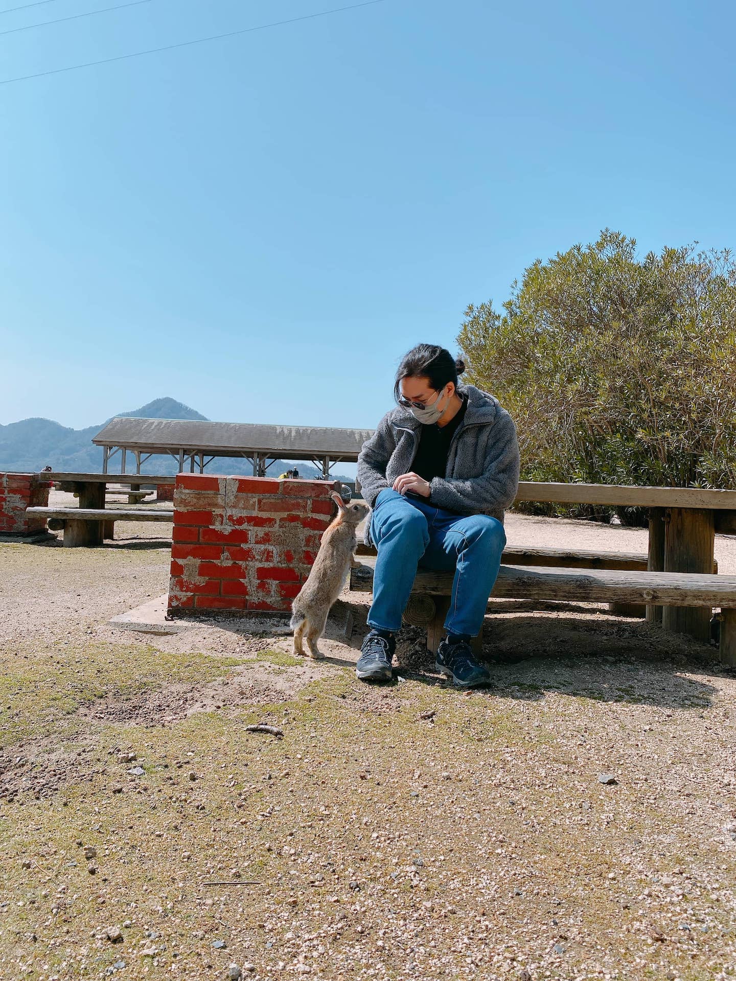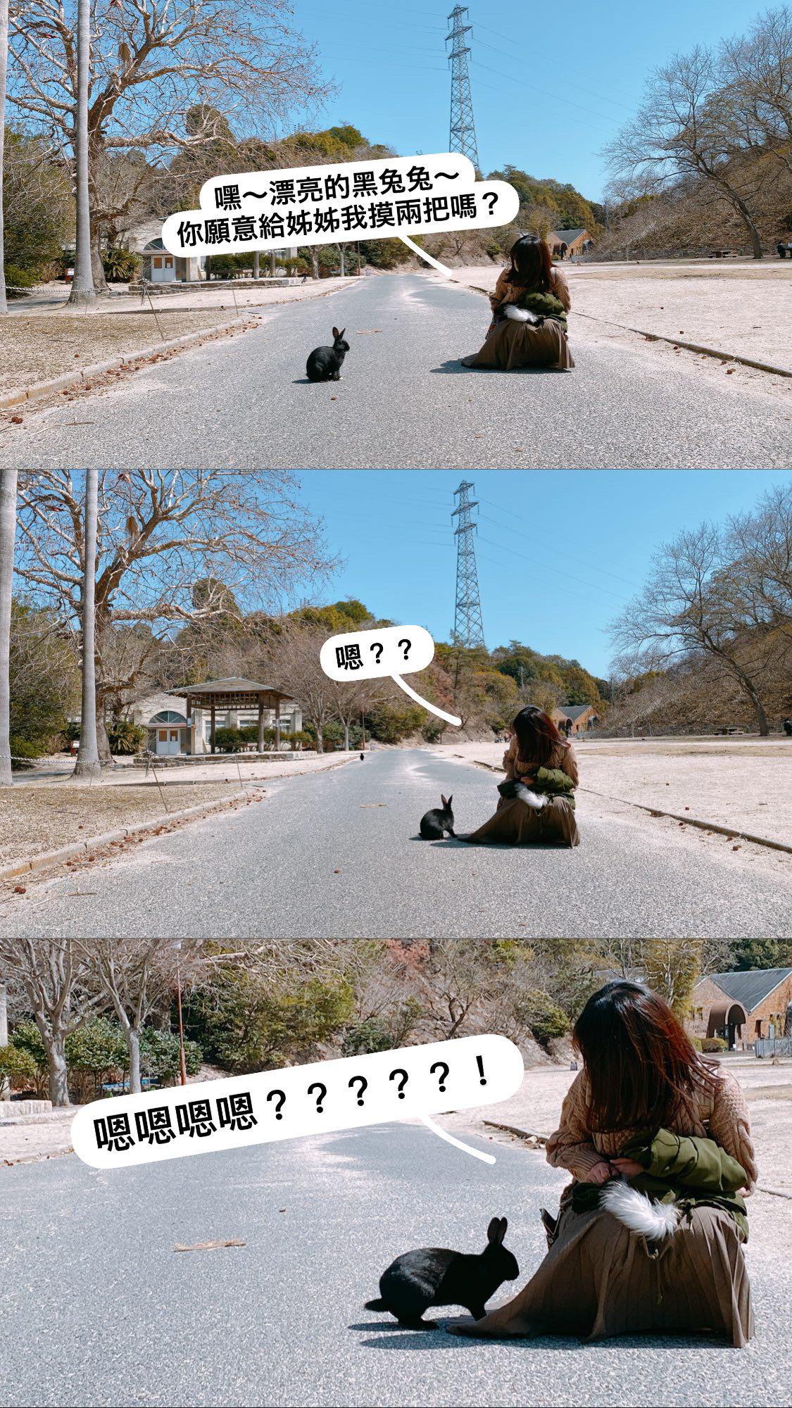 千里迢迢來到大久野島,當然是要摸個回本才行啊!!於是我們開始物色兔兔,並帶著不懷好意(?)的臉靠近目標時,誰知到兔兔竟然拔腿就跑!!